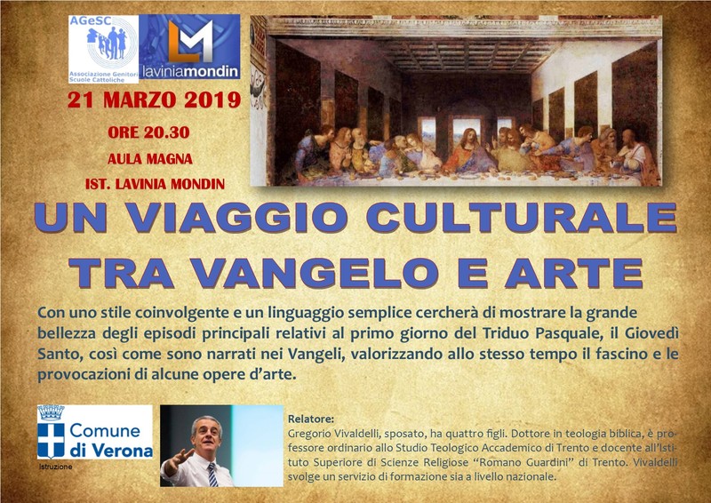 Alle ore 20.30 presso l'Aula Magna dell'Istituto "Lavinia Mondin", il relatore Gregorio Vivaldelli, ci porterà in "Un viaggio culturale tra Vangelo e Arte", con uno stile coinvolgente e un linguaggio semplice.